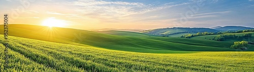 Obraz premium Sunrise over rolling hills with golden light illuminating lush fields, serene...