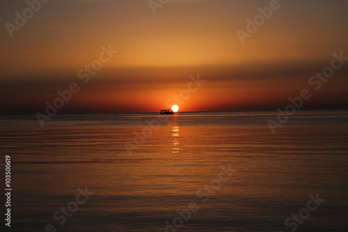 © Vitaly Zubrytsky, Naklejka premium Sunrise over sea with boat