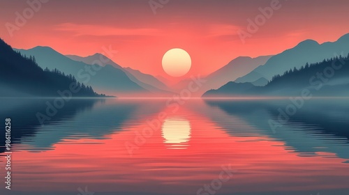 © julija, Naklejka premium sunrise over serene lake golden eye reflecting in water minimalist vector art style clean lines muted palette ethereal atmosphere isolated composition