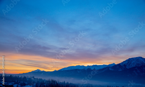 Fototapeta premium Sunrise over snow Tatry mountains in winter time.