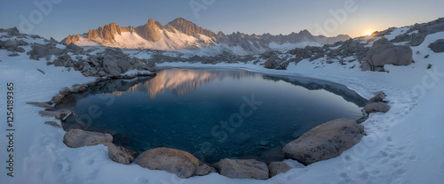 © Demok, Fototapeta premium Sunrise Over Snowy Mountain Lake