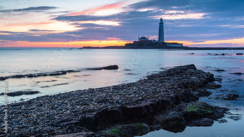 Fototapeta premium Sunrise over St Mary's Lighthouse and island at Whitley Bay on the north east...