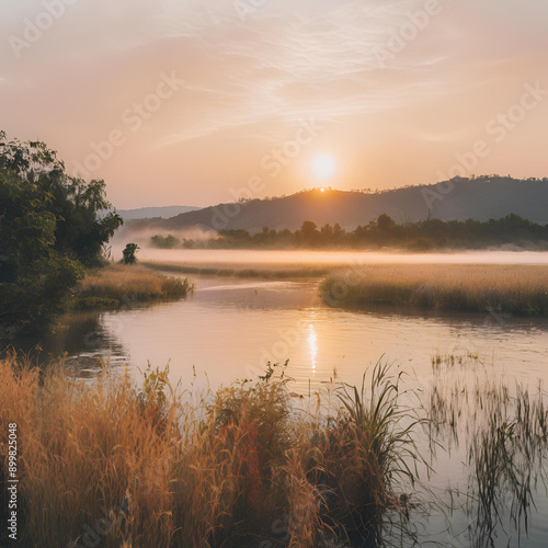 © Thawatchai, Fototapeta premium sunrise over the lake