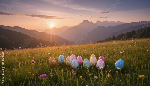© Konstantin, Fototapeta premium sunrise over the mountains easter eggs in the meadow