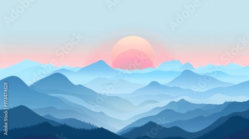 © Postproduction, Fototapeta premium Sunrise over the mountains flat isolated illustration. Serene and picturesque landscape design. Nature and outdoors concept.