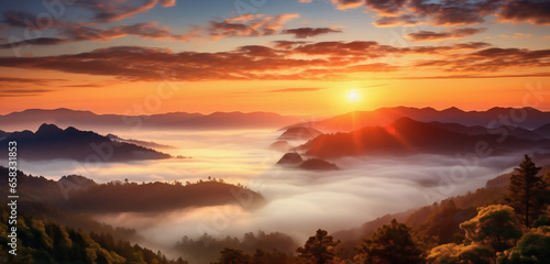 Fototapeta premium Sunrise over the mountains. Mountain landscape at sunrise. Generative artificial intelligence