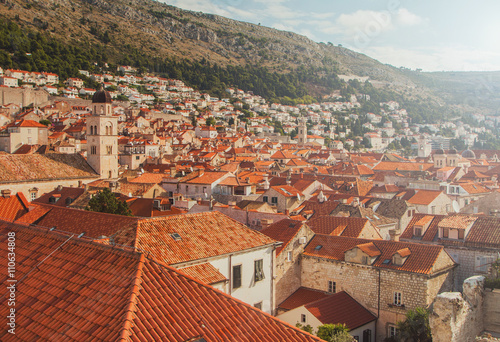 Obraz premium Sunrise over the old city of Dubrovnik, Croatia, Franciscan church with tower bell and roofs of old houses, warm filter applied