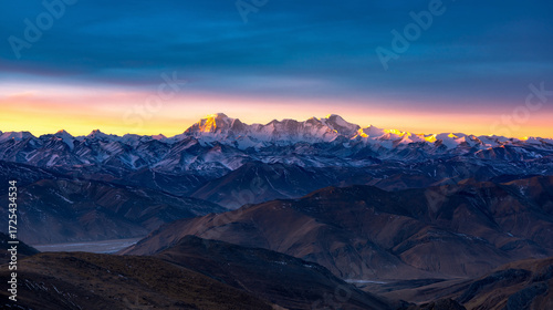 © hu, Naklejka premium Sunrise over the snow-capped mountains from a viewing platform on the way to Mount Everest in Tibet