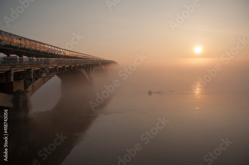 © Oleh, Fototapeta premium Sunrise over the spring river. A bridge over a large river.. Fog on the river in early spring