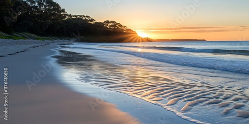 Fototapeta premium Sunrise over tranquil beach with gentle waves and golden light on horizon...