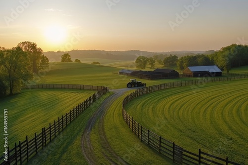Fototapeta premium Sunrise over tranquil farm fields, tractor on dirt road.