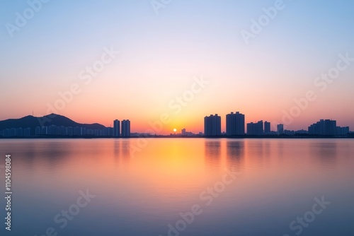 Fototapeta premium Sunrise over urban skyline reflecting on calm waters