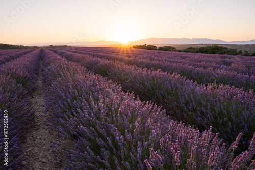Obraz premium Sunrise over Valensole lavender fields in Provence, France