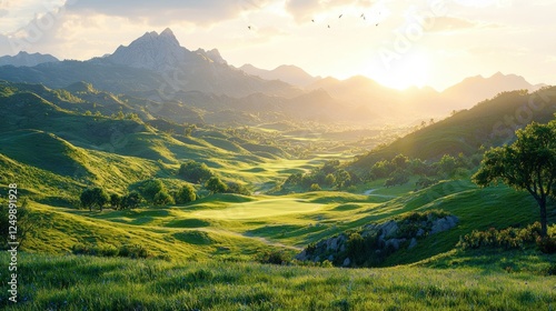 © Dece Std, Fototapeta premium Sunrise over valley golf course, mountains, birds. Possible use travel brochure, nature calendar