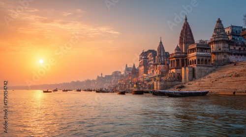 © backup_studio, Obraz premium Sunrise over varanasi ghats and ganga river with ancient temples. Sacred indian culture and spiritual travel destination. Boating at dawn.
