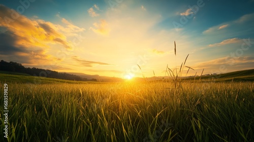 Fototapeta premium Sunrise over verdant fields nature landscape serenity rural environment expansive viewpoint tranquil beauty