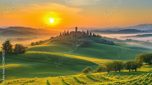 © Peerawat, Naklejka premium Sunrise over vineyard hills tuscany landscape photography serene environment wide-angle view nature's beauty
