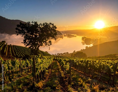 © BAPAK, Naklejka premium Sunrise over vineyard with lake