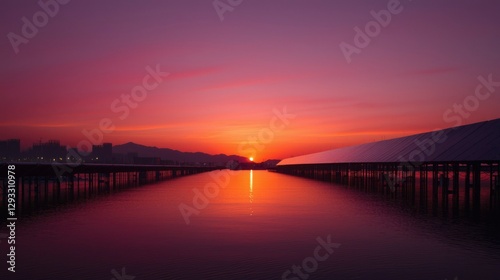 Fototapeta premium Sunrise over water with solar panels and cityscape