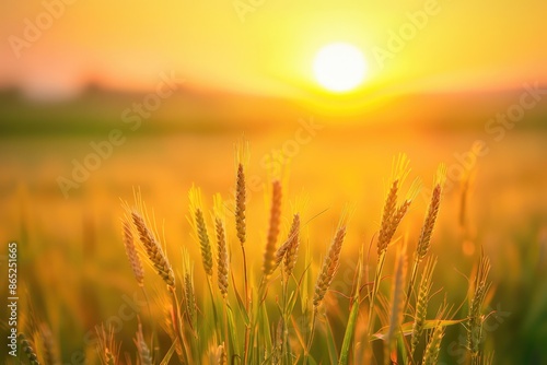 © Alona, Obraz premium Sunrise Over Wheat Field. Golden Wild Wheat Glowing in Sunlight
