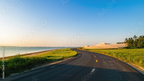 Fototapeta premium Sunrise over white sand dunes with water and sky in a summer beach landscape