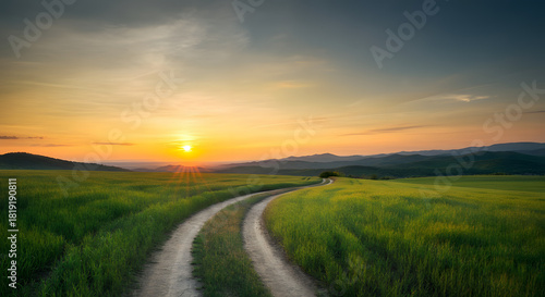 © Fikri Haikal, Fototapeta premium Sunrise over winding road landscape