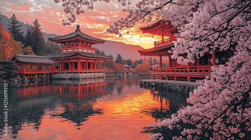 © Matteo_std, Fototapeta premium Sunrise Pagoda Reflection, Cherry Blossoms, Japan.