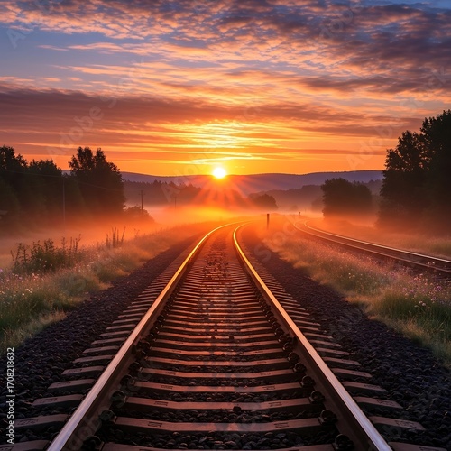 © Jafar, Fototapeta premium Sunrise paints a golden path along the railway tracks, disappearing into a misty horizon.