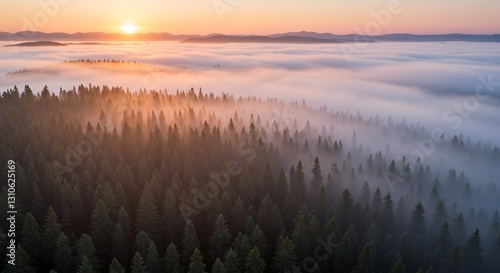 © Phung, Fototapeta premium Sunrise paints misty forest in warm hues. AI Generated