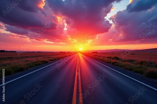 Fototapeta premium Sunrise paints vibrant hues across a rural asphalt highway , yellow, rural...