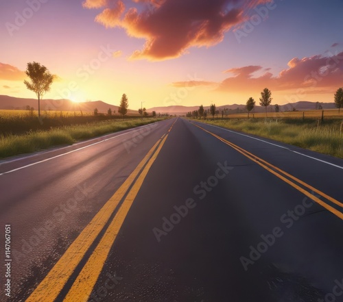Fototapeta premium Sunrise paints vibrant hues across rural asphalt highway , tranquil, freedom