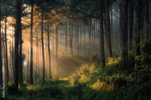 © Erwin, Obraz premium Sunrise penetrates misty pine forest
