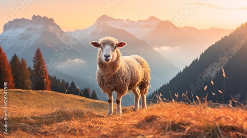 Fototapeta premium Sunrise Serenity in the Dolomites: A High-Resolution Capture of Grazing Sheep, Majestic Mountain Peaks, and Mystical Morning Mist under a Pastel Dawn Sky