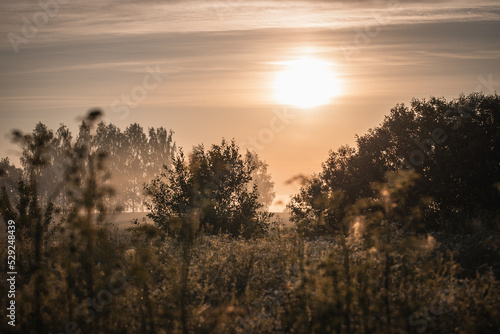 Fototapeta premium Sunrise shining over the treetops in a wheat field