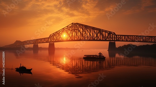 Fototapeta premium Sunrise silhouette of Howrah Bridge a suspended span over the Hooghly River in West Bengal