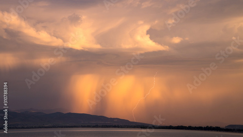 Naklejka premium Sunrise storm with lightning strike looking past Utah Lake.