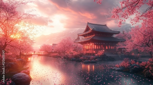 Fototapeta premium Sunrise Temple, Cherry Blossoms, Peaceful Asian Landscape, Calm River, Digital Art