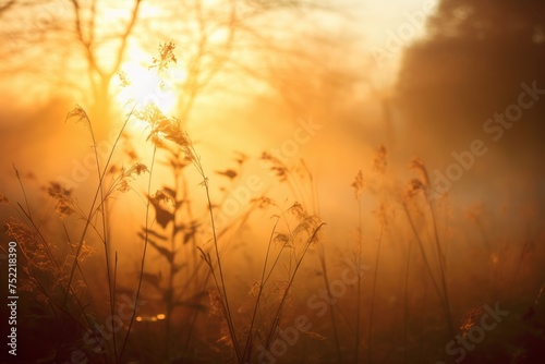 © ToonArt, Fototapeta premium Sunrise through Fog: Soft bokeh lights through a misty morning.