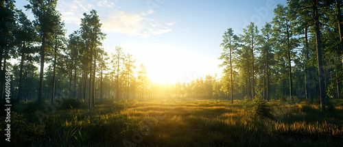 Obraz premium Sunrise Through Pine Trees In A Forest