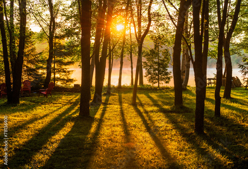 © SHS Photography, Fototapeta premium Sunrise Through the Trees Across a Misty Lake