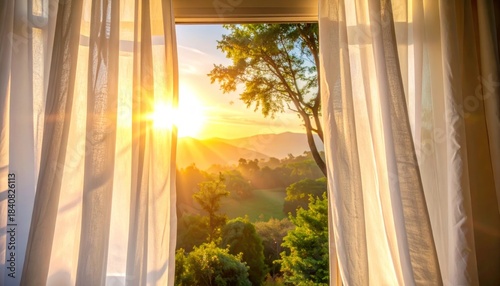 © KASANUN, Fototapeta premium Sunrise through window curtains