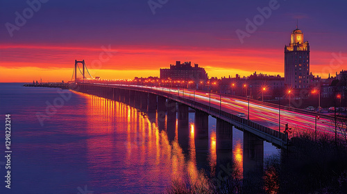 Fototapeta premium Sunrise Traffic on City Bridge, Vibrant Sky Reflection