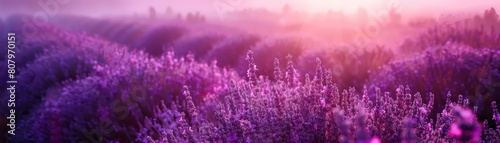 © JK_kyoto, Naklejka premium Sunrise unfurls over a misty lavender field on gentle hills, awakening the land, Sharpen banner template with copy space on center