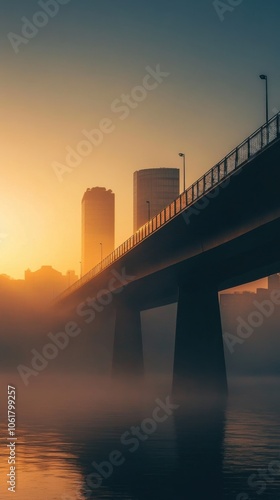 Obraz premium Sunrise view of an iconic bridge over a river with a city skyline shrouded in morning mist and soft golden light