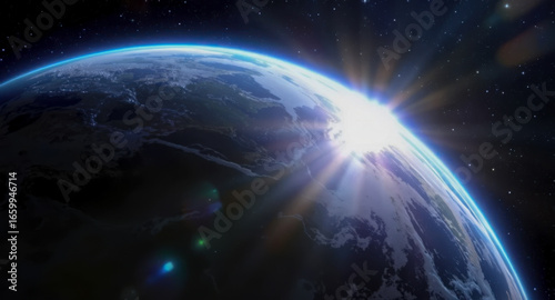 © Rajesh, Fototapeta premium Sunrise view of Earth from space, with bright light radiating across the planet.