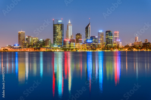 © Stefan Mokrzecki, Fototapeta premium Sunrise view of Perth city skyline and the Swan River seen from Mill Point. The modern city of Perth is the state capital of Western Australia, Australia.