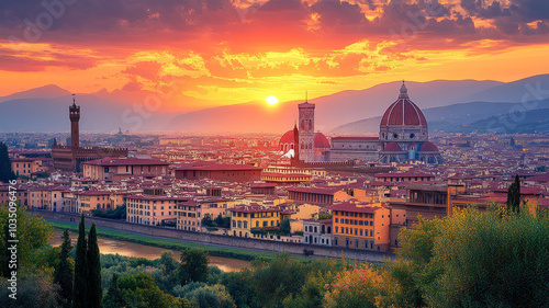 © Suralai, Fototapeta premium Sunrise view on Florence city centre and Duomo from Vista panoramica di Firenze