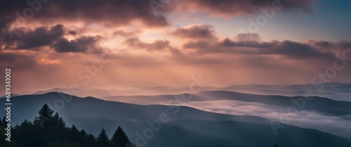 © abu, Fototapeta premium sunrise view over the foggy mountains
