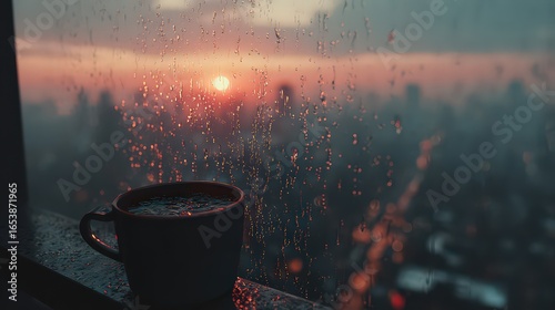 Obraz premium Sunrise View Through Rainy Window With Coffee Cup