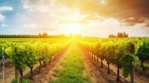 Fototapeta premium Sunrise vineyard rows, vibrant green landscape